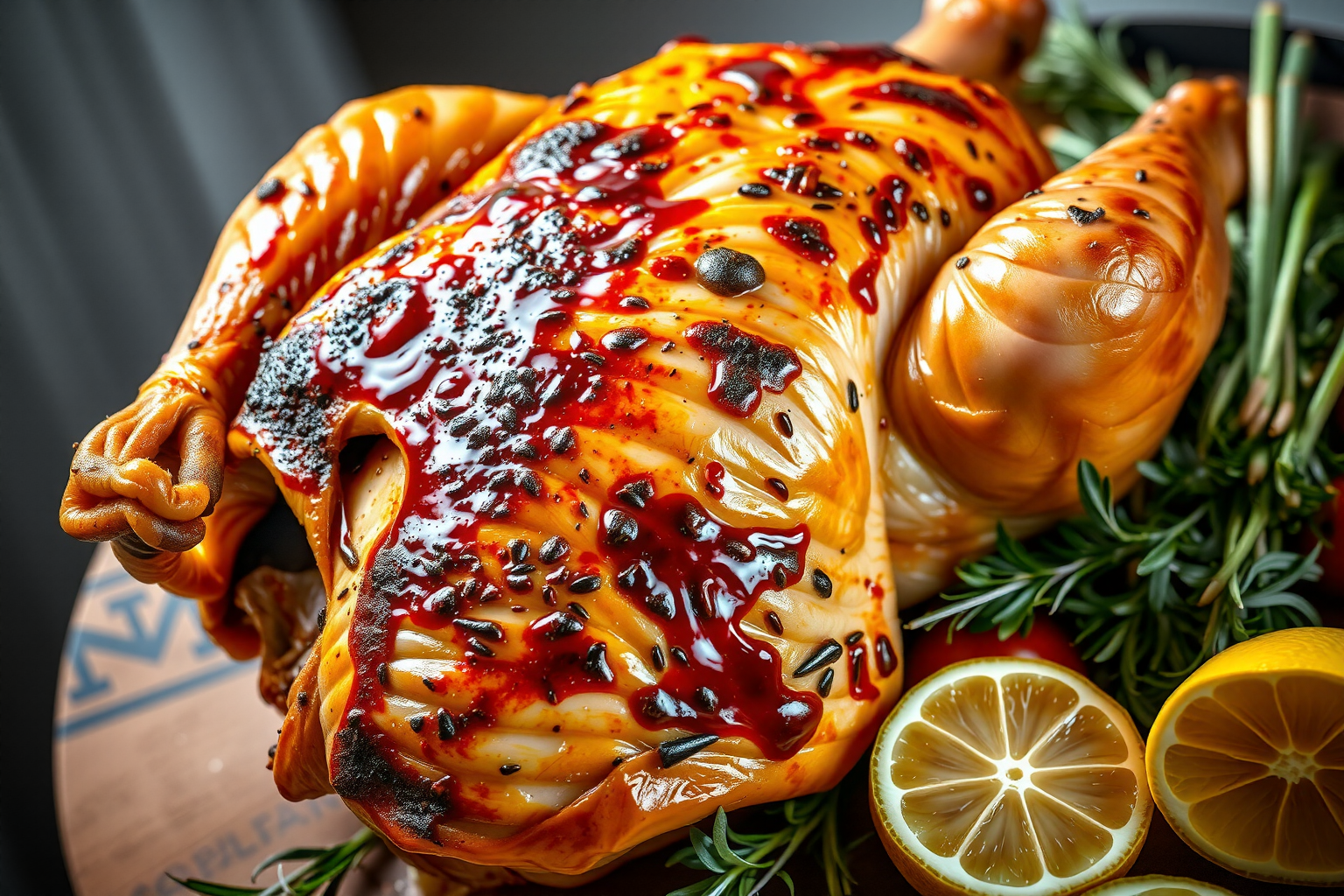 Place the chicken in a large roasting pan. Pour the marinade over the chicken and rub it thoroughly into the skin, making sure it gets into all the nooks and crannies. Cover the roasting pan and let the chicken marinate in the fridge for at least 4 hours, or preferably, overnight.
