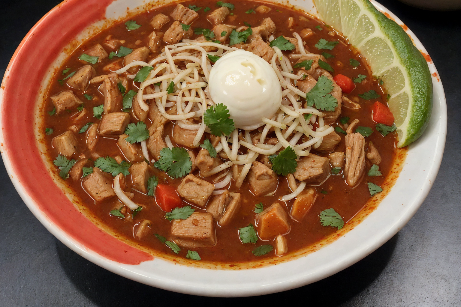 There is a green and a red version. The red Pozole is typically made with pork, chicken, beef, or a combination of these meats. The green variety is generally made with chicken. It is usually accompanied by a variety of garnishes, such as chopped onions, lettuce, radishes, lime juice, and other items. In some regions of Mexico, avocado and chile contain are also used.